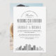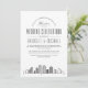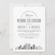 It features a modern deco-style illustration of the city's skyline resting towards the bottom. Centred above this are the names of the wedding couple and your wedding day information in matching open-lined style text. This is presented in a neutral black and white, classic colour theme.