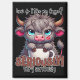 A funny and sarcastic colorful design showcases an adorable highland cow sitting with a coffee mug. The cow, with big blue eyes, a serious expression, a lipstick kiss on his gray fur, adds a playful touch. The vibrant text reads, "How do I take my coffee? Seriously! Very seriously." This design is available on a wide range of products, making perfect gifts for coffee enthusiasts.