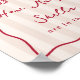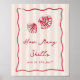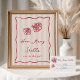 This beautiful coastal bridal shower guessing game sign features red handwritten style cursive lettering accented with a wavy scribble ribbon border, with two hand drawn seashell illustrations and the words "how many shells are in the jar?" Ready to frame; choose professional printing and shipping or the instant download option to print locally or at home. Pair with our matching shell guessing game cards from our Love & Lobster collection.
