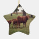 Loveable Red Angus cow and her calves look curiously while taking a break from their contented grazing in a wooded pasture. Ornament reverses to country green stripes.