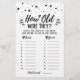 Purchase this monochrome game and enjoy high quality How old were they card for your event! Guess the ages of the Bride and Groom-to-be in the photos. Silver confetti. Black and White design.