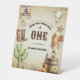 Saddle up and welcome your guests to a fun Western-style cowboy first birthday party. A weathered parchment background showcases elements of a perfect rodeo birthday party, including a cactus, guitar, wagon wheel, cowboy boots, saddle, tumbleweed, and much more! Western-style ornaments decorate the sign to create a unique theme for a first birthday or other age birthday parties. Use as a welcome or informational sign. Available with matching products.