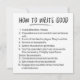 Funny "How To Write Good" writer's design is a simple text design with a list of ten funny, play on words, rules to follow when writing. This simple yet hilarious writer's design makes a nice gift for English teachers, writers, novelists, journalists and anyone else who writes or teaches English for a living.