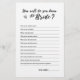 Test the bridal shower guests' knowledge of the bride by having them answer the questions on this card. You can customize the questions to suit the bride! This "How Well Do You Know The Bride" game is a fun activity for a bridal shower, engagement party, bachelorette party or wedding reception and a great way to break the ice between the guests.