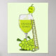 A green grape showing how wine is made by peeing in a wine glass. Funny and silly graphic illustration design. Green coloured background. Wine Glass with a ladder so the grape can climb.graphics