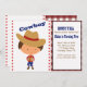 Howdy Y'All! Having a party or a rodeo. This American cowboy invitation is adorable. It has red small stars down the left side and down the middle. On a white background there's a cowboy with a big tan cowboy hat. He's wearing blue shorts with white stars and a red shirt with a tan vest. On the right half of this invite is a white rectangle where you add your personalised party information. Around the outside is a plaid red and white patterned border. Check out all the other designs and products we have in our store. ©graphico