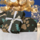 A playful Halloween-themed pattern featuring tan paw prints, teal bats, and scattered bones against a dark background. Accented with small starbursts, this design blends spooky and cute elements—perfect for pet lovers looking to celebrate the season with a touch of whimsy. Ideal for wrapping paper, fabric, or festive accessories.