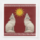 A colourful graphic of howling coyotes in the colours and style of traditional southwestern art.