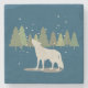 A Minimalist design of a white howling wolf with snow and pine forest background.
