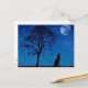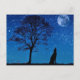 A drawing of a black wolf silhouette howling at the moon with a tree in the background.