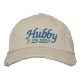Custom Embroidered District Threads Distressed Chino Twill Baseball Cap Hat in Stone Colour with Hubby in Royal Blue text typography lettering and digital graphic design by TheFabricSeal print on demand shop at Zazzle.com #ZazzleMade https://www.zazzle.com/store/thefabricseal TheFabricSeal©️Original.