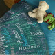 Typographic short name text aqua, woodland green, grey, muted purple on a dark green background custom blanket design. Background colour can be changed if required. Fun personalised graphic text personalised blanket. Ideal for the car, camping for winter nights or trips out. Personalise with your own short name, currently reads Hudson for help with personalisation and other name lengths please contact me. © Art and design by Sarah Trett for www.mylittleeden.com