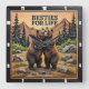 This appealing square wall clock features a highly dimensional illustration of two golden-brown bears hugging in a mountain meadow setting. The artwork is rendered in vibrant brown, green, and orange tones, strongly suggesting a deep carved relief or Engraved Wood Look. The bears have highly textured fur and are positioned against a backdrop of dark pine trees and layered brown mountains. The foreground features detailed grass, brush, and light gray rocks, emphasizing the outdoor, nature theme. The carving style gives the entire image a strong three-dimensional, sculpted quality. The large, three-dimensional embossed text "BESTIES FOR LIFE" is carved across the top. The clock face features a simple clock face border with large, white, numbered tick marks (1 to 12) integrated into the outer frame. The artwork is surrounded by a thick, dark brown decorative border that resembles a black wood frame.