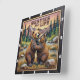 This appealing square wall clock features a highly dimensional illustration of two golden-brown bears hugging beside a stream or river. The artwork is rendered in warm brown, green, and pale orange tones, strongly suggesting a deep carved relief or Engraved Wood Look. The bears have highly textured fur and are positioned on a bank of grass and rocks. The background includes dense, stylized pine trees and layered mountains, indicating a woodland valley setting. The carving style gives the entire image a strong three-dimensional, sculpted quality. The large, three-dimensional embossed text "BESTIES for LIFE" is carved across the top. The clock face features a simple clock face border with large, white, numbered tick marks (1 to 12) integrated into the outer frame. The artwork is surrounded by a thick, dark brown decorative border that resembles a black wood frame.