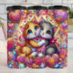 This vibrant digital illustration features two adorable kittens—one ginger and one grey—sharing a warm hug. The artwork is a festive explosion of Valentine imagery, featuring large ornate hearts filled with colorful patterns, swirling ribbons, and a variety of pink and red roses. The kittens possess large, expressive blue and black eyes, adding a whimsical and heartwarming touch to the design. This seamless-style graphic is created as a full-wrap for insulated tumblers, providing a high-impact, 360-degree visual experience. The dense, colorful palette of magenta, cyan, and gold makes it an ideal gift for cat lovers and holiday celebrations.