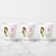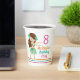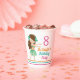 A cute hula girl birthday party paper cup with a pretty child in a green hula skirt and hibiscus flowers in her brunette hair. Customise with your birthday girl's name, age, and text for a Luau themed party on the island of Hawaii.
