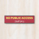 This minimalist design features the message "NO PUBLIC ACCESS", along with the message "Staff Only". This might be used in a business or a shop to inform patients, customers or visitors that access to a particular room or area is restricted to staff or employees only.