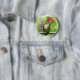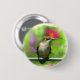 This button features a young ruby-throated hummingbird who has not yet developed the ruby coloration on his throat. He is sitting on a metal bar, ready to dive into the nectar from the flowers surrounding him. The background is a soft, lovely palette of pink, red, gold, yellow and green.