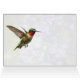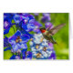 A brilliant male ruby throated hummingbird photographes in a summer garden with a larkspur blossum.