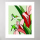 Stylized art of male and female Ruby Throated hummingbirds flying among large flowers