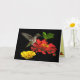 This birthday card features a female ruby-throated hummingbird. She hovers in the air while drinking nectar from the golden centre of a bright red zinnia flower. A yellow zinnia blossom is nearby and a few green leaves complete the composition. The colours seem to glow against the dark background. The image is repeated inside. The text can be customised to suit your needs.