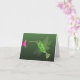 Beautiful hummingbird wth irridescent body is hovering at a pink flower. Vector design on blank notecard for bird lovers.