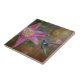 This ceramic tile features a hummingbird gathering nectar from a pink clematis blossom.