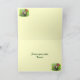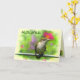This Día del Padre card features a young ruby-throated hummingbird. He has not yet developed the ruby coloration on his throat. He is sitting on a metal bar, ready to dive into the nectar from the flowers surrounding him. The background is a soft, lovely palette of pink, red, gold, yellow and green. More hummingbirds are inside. All text can be customized to suit your needs.