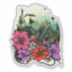 This vibrant graphic design captures the essence of springtime in a lush garden, where a delicate hummingbird flits gracefully among a tapestry of colourful flowers. The scene is bursting with life, featuring a rich palette of blooming blossoms in shades of pink, yellow, and purple, contrasted by the deep greens of flourishing trees that sway gently in the warm breeze. Sunlight filters through the leaves, casting a golden glow over the entire landscape, highlighting the iridescent feathers of the hummingbird as it hovers, poised to sip nectar from a nearby bloom. This enchanting portrayal invites viewers to immerse themselves in the beauty of nature, evoking feelings of joy, tranquillity, and the wonder of the outdoors.