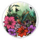This vibrant graphic design captures the essence of springtime in a lush garden, where a delicate hummingbird flits gracefully among a tapestry of colourful flowers. The scene is bursting with life, featuring a rich palette of blooming blossoms in shades of pink, yellow, and purple, contrasted by the deep greens of flourishing trees that sway gently in the warm breeze. Sunlight filters through the leaves, casting a golden glow over the entire landscape, highlighting the iridescent feathers of the hummingbird as it hovers, poised to sip nectar from a nearby bloom. This enchanting portrayal invites viewers to immerse themselves in the beauty of nature, evoking feelings of joy, tranquillity, and the wonder of the outdoors.