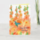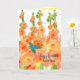 A bright floral happy birthday greeting card for an aunt decorated with a garden of orange hollyhocks in full bloom with a turquoise blue hummingbird happily visiting hand painted with watercolor. You can customise the text and the inside colour to fit your needs.