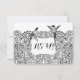 Hummingbird Love Bird Wedding RSVP Insert Response Card. Black and White Design Black Information Script Lettering Black Intricate Pattern accompanied by a Lovely Humming Bird sitting on a swirly Branch over a backdrop of intricate and lovely pattern with two romantic love birds sweetly adoring to each other. Vintage Bird Weddings and Special Occasions maybe similar to Mehndi Bridal Designs this Bird Wedding Collection is perfect for that unique Love Bird Wedding. With just the right amount of whimsy and perfectly elegant with a fairy tale feel/ Perfect for that romantic whimsical one of a kind unique wedding. Sweetly romantic and full of whimsy.