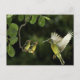A Hummingbird mother bringing her baby hummingbirds there food up in a tree on a branch with green leaves on the tree.