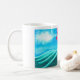 A watercolor painting of a colorful Hummingbird, Fancy Flowers, a Wave & a very Blue Sky with Fluffy Clouds. Makes a fun gift for the nature lover in your life.