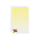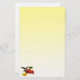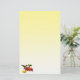 This stationery features a female ruby-throated hummingbird. She hovers in the air while drinking nectar from the golden centre of a bright red zinnia flower. A yellow zinnia blossom is nearby and a few green leaves complete the composition. The colours seem to glow against the yellow gradient background.