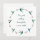 Note card for hummingbird lovers featuring a wreath of North American hummingbirds such as Violet-eared, Broad-billed and Rufous-tailed Hummingbirds and the quote "Time spent watching hummingbirds is never wasted." All bird images and quote by C. Dobbins.