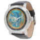 This image is a circular watch with a black rim and white numbers. The watch face features a whimsical illustration of a blue narwhal with a golden tusk, wearing snorkelling goggles and reading a newspaper titled "NARWHAL TIMES" while sitting on a toilet underwater. The underwater scene includes blue tiled walls, seaweed, starfish, and a seahorse, with bubbles floating around the narwhal, all contained within a golden inner frame.