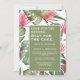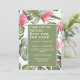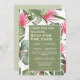 A fun wedding invitation to send to family and friends with tropical leaves in the background.