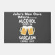 Add humour to your drinks with this humourous white text man cave sarcasm design featuring the phrase "Alcohol Goes In Sarcasm Comes Out." The bold white text brings a witty vibe for adults to enjoy. Perfect for social gatherings or enhancing your decor with a personal touch.