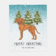Destei's original cartoon illustration of a cute Hungarian Vizsla breed dog. The dog is placed in a winter scene with three green fir trees and falling snow. The background is a blue to white gradient giving the design that cold winter day look. There is also a personalizable text area that now reads "Merry Christmas!". Under it is another personalizable text area for a family name or other custom text.