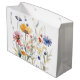 Hand-drawn, watercolor wildflowers fill a meadow and the front and back of a gift bag with soft colours: yellow, blue, red, grey, terra cotta and green. Coordinates with 'Hunny' Wildflower Gender Neutral Baby Shower Invitation & Collection or is beautiful for stand-alone gifts for birthdays, anniversaries, or "just because."