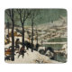 This design features an oil-on-wood painting by the 16th-century artist Pieter Bruegel the Elder (1525/1530–1569), who was one of the most significant artists of Dutch and Flemish Renaissance painting. It shows a scene of the winter season in which three hunters can be seen returning from an expedition accompanied by their dogs. The hunters have not been very successful and their dogs appear weary and tired. It is a scene of great pathos. However, one of the men is carrying the slender body of a dead fox. At a nearby inn, some adults and a child prepare food over an open fire. Birds such as crows and magpies are sitting in the bare trees; some critics have seen them symbolically as bad omens. The landscape is a flat-bottomed valley covered with white snow, and there is a river meandering through it; people are also playing hockey or ice skating on frozen lakes. There are wild mountain peaks in the background, despite the fact that such summits do not exist in the Low Countries of Belgium, the Netherlands and Luxembourg. The painting is sometimes also titled "The Return of the Hunters"; its original Dutch title is "Jagers in de sneeuw" [Hunters in the Snow]. The original work was completed in 1565, and it is now housed in the Kunsthistorisches Museum [Museum of Fine Arts], Vienna, Austria.
