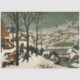This design features an oil-on-wood painting by the 16th-century artist Pieter Bruegel the Elder (1525/1530–1569), who was one of the most significant artists of Dutch and Flemish Renaissance painting. It shows a scene of the winter season in which three hunters can be seen returning from an expedition accompanied by their dogs. The hunters have not been very successful and their dogs appear weary and tired. It is a scene of great pathos. However, one of the men is carrying the slender body of a dead fox. At a nearby inn, some adults and a child prepare food over an open fire. Birds such as crows and magpies are sitting in the bare trees; some critics have seen them symbolically as bad omens. The landscape is a flat-bottomed valley covered with white snow, and there is a river meandering through it; people are also playing hockey or ice skating on frozen lakes. There are wild mountain peaks in the background, despite the fact that such summits do not exist in the Low Countries of Belgium, the Netherlands and Luxembourg. The painting is sometimes also titled "The Return of the Hunters"; its original Dutch title is "Jagers in de sneeuw" [Hunters in the Snow]. The original work was completed in 1565, and it is now housed in the Kunsthistorisches Museum [Museum of Fine Arts], Vienna, Austria.