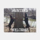 This door mat features a photo of two black and tan coonhounds treeing and says HUNTERS WELCOME.