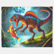 This fleece blanket has a hunting dinosaur on it.