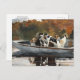A postcard with the fine art watercolor painting by the American artist Winslow Homer titled, Hunting Dogs in Boat (Waiting for the Start) (1889). An autumn scene of several beagles in a rowboat on the water.