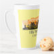 Stylish latte mug features Huntington Beach, CA city silhouette with latitude and longitude coordinates and an orange sunset watercolor wash on yellow background.