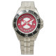 Has heft and feel of expensive stainless steel quartz watches. Good band with safety catch. I removed links, which is easy because engraved arrows show direction to push the linking pins. As always by this seller, the image (a railroad logo) is a perfect reproduction of my emailed image, and is precisely spaced and aligned.