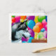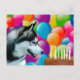 Black and white Siberian Husky looks hungrily at the chocolate birthday cake and lit candles with a background full of balloons dog lovers birthday postcard