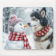 A husky dog and a snowman face each other surrounded by a snowy landscape